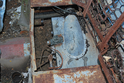 View of the inside floor board of the car with the seats out. Engine is the classic 20 hp Stanley, two cylinder double acting 4” bore and 5” stroke slide valve and Stephenson reversing link that also acts as a cutoff control. This Pontiac Tempest was chosen because it had independent suspension, meaning that the original differential and integral transmission were bolted to the floor boards. The stub axles were affixed to the suspension, thus greatly reducing unsprung weight. The Stanley engine, as mounted in a Stanley automobile, is supported in the front by a ball, fitted into a socket, so that it can move up and down and rotate with the rear axle. The original Stanley-made Locomobile had a chain drive from the engine to the axle. This arrangement had been patented by the Stanleys and then sold to the purchasers of the Locomobile company, thus they had to come up with another way of transmitting power from the engine to the wheels, hence the straight cut spur gear on the engine meshing with the same style of gear teeth cut into the ring gear of the differential. This was a long way around the barn to making a steam powered car with good suspension by minimizing the unsprung weight. |