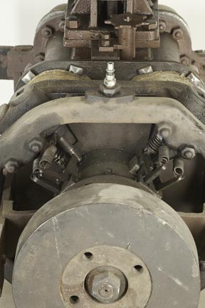 | This is a General Electric steam engine and boiler originally made for installation in a car. This work was done in the 1920’s and about 6 vehicles were made with one or two still in existence in Australia. This power unit was taken out of a car and for years ran in a boat owned by A. M. Stanley, an engineer for GE. A. M. Stanley also has the patent #995,384 from 1911 on this engine and valve gear. It is basically a sliding cam shaft with several grinds to change the cutoff timing that actuates poppet valves. The basic engine design is covered in patent #747,926 by H. S. Baldwin, 1903, also assigned to GE. It is a very compact design and quite economical in that the geometry allows for needing only one cam with a very short valve train to the cylinder heads. The engine runs good on air. |
