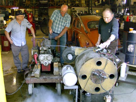 Mobile Steam Society (MSS) Shop Boiler, personnel from L. to R. Ken Helmick, Tom Kimmel, Bob Edwards. MSS was founded in Oak Ridge, Tennessee by twenty or thirty nuclear engineers to make a modern clean burning thermodynamically efficient steam engine. |